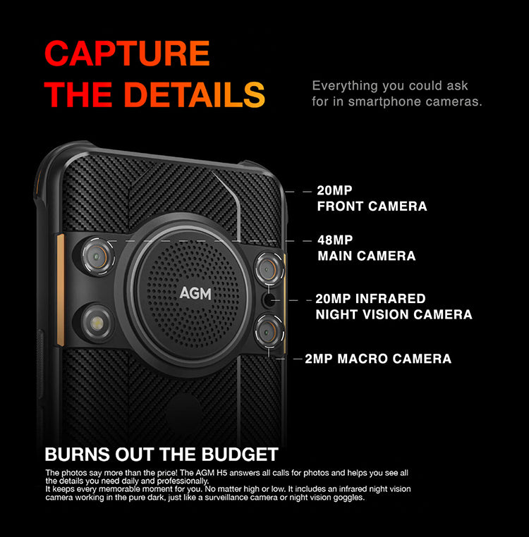 The photos say more than the price! The AGM H5 answers all calls for photos and helps you see all the details you need daily and professionally. It keeps every memorable moment for you. No matter high or low. It includes an infrared night vision camera working in the pure dark, just like a surveillance camera or night vision goggles.