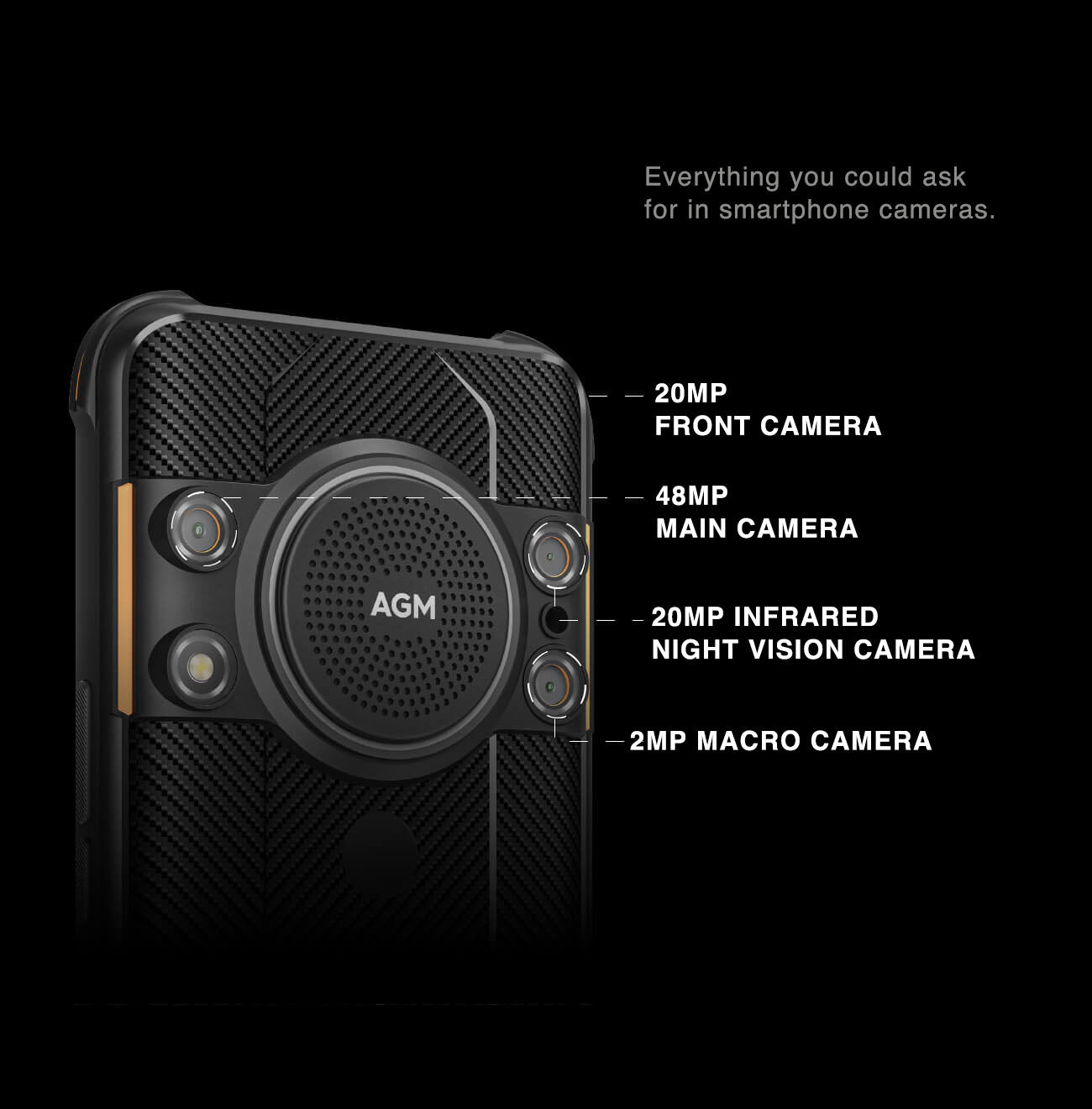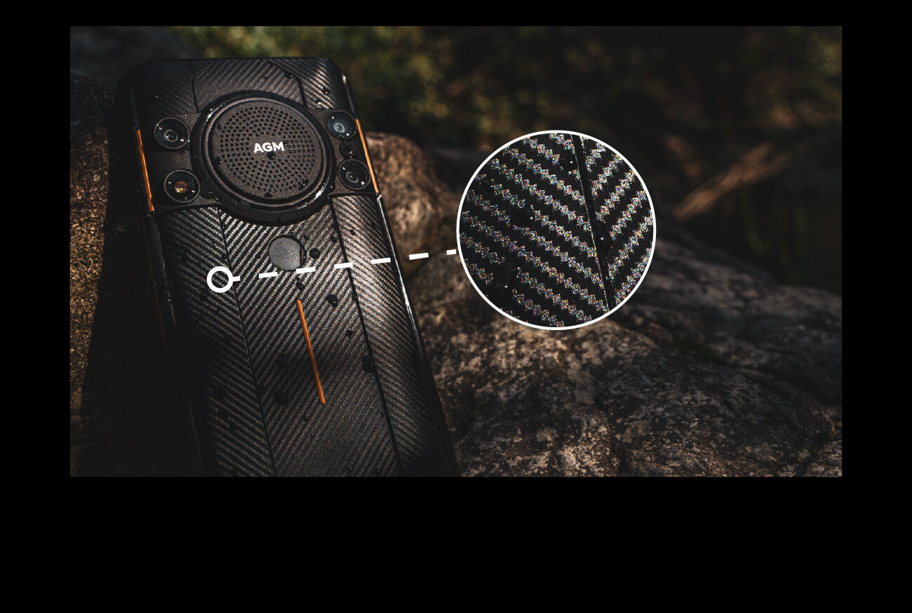 The AGM H5's back shield is fabricated similarly to the aramid fiber*, a bulletproof material used for aerospace engineering and military equipment. It gives a unique and smooth texture. It makes H5's exterior cover harder against scratches.