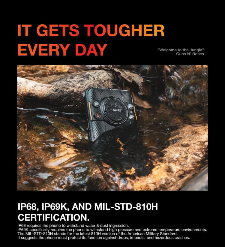 The AGM H5 can survive drops from 1.5 meters, 99% dust, and 30 minutes under 1.5 meters of water. It’s not about standards; it is about toughness. While reinforcing the corners to give the entire structure extra toughness.