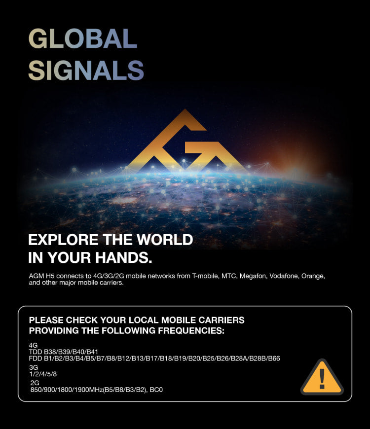 AGM H5 connects to 4G/3G/2G mobile networks from T-mobile, MTC, Megafon, Vodafone, Orange, and other major mobile carriers.