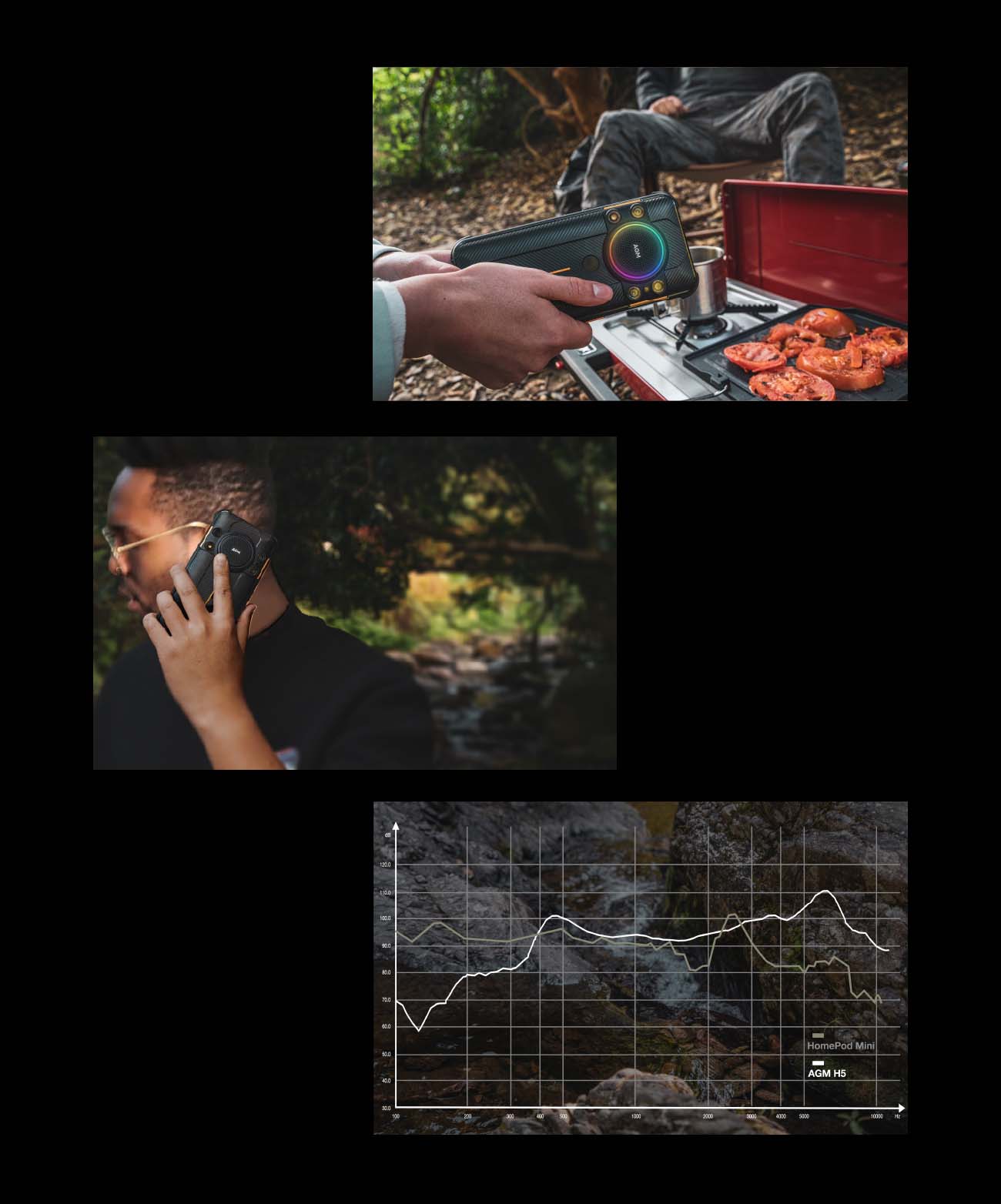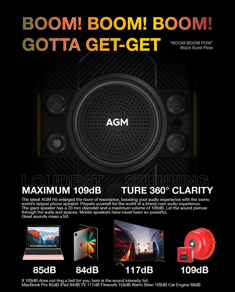 The latest AGM H5 enlarged the room of resonance, boosting your audio experience with the iconic world’s loudest phone speaker. Prepare yourself for the world of a brand-new audio experience. The giant speaker has a 33mm diameter and a maximum volume of 109dB. Let the sound pierce through the walls and spaces. Mobile speakers have never been so powerful. Great sounds mean a lot.