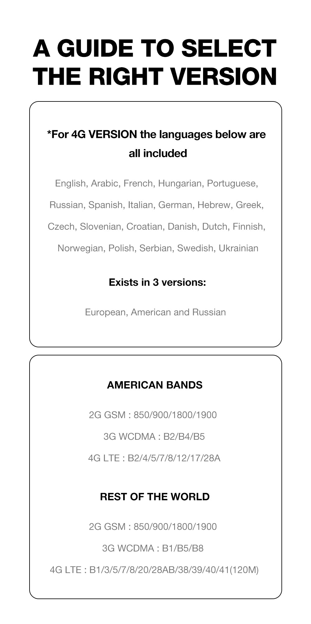 GSM :850/900/1800/1900 WCDMA:B2/B4/B5 LTE:B2/4/5/7/8/12/17/28A
