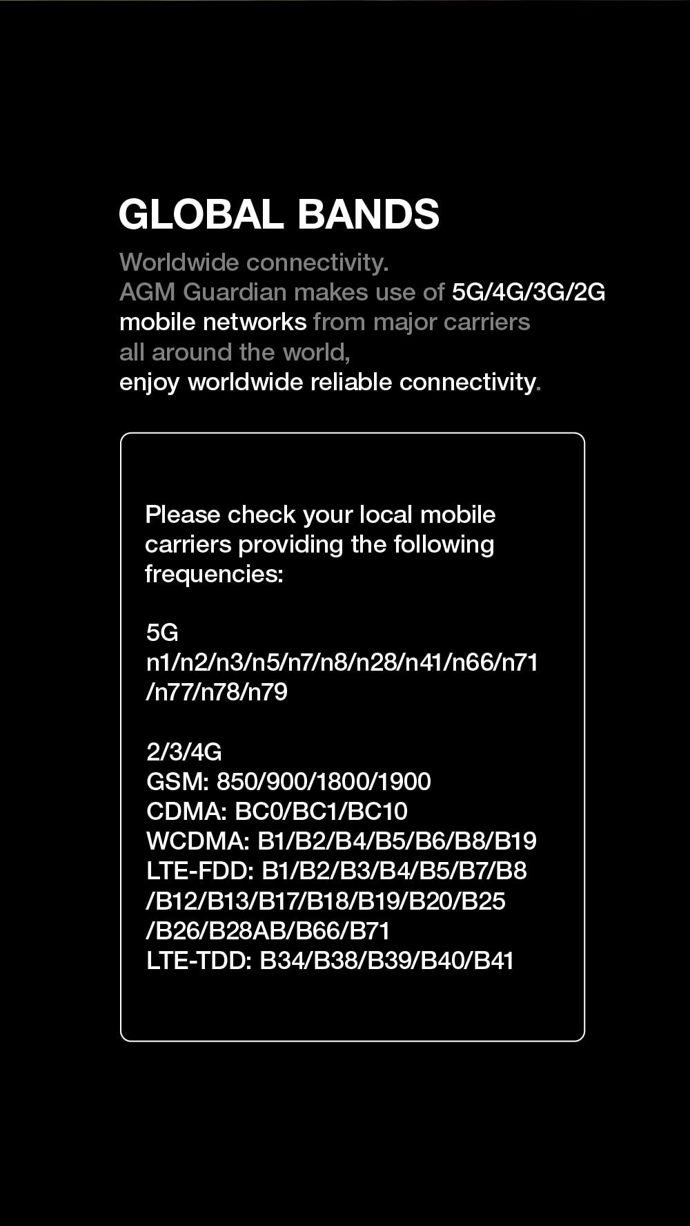 GSM: 850,900,1800,1900 CDMA:BC0, BC1, BC10 WCDMA: B1,B2,B4,B5,B6,B8,B19 LTE-FDD: B1,B2,B3,B4,B5,B7,B8,B12,B13,B17,B18,B19,B20,B25,B26,B28AB,B66、B71 LTE-TDD: B34 B38 B39 B40 B41